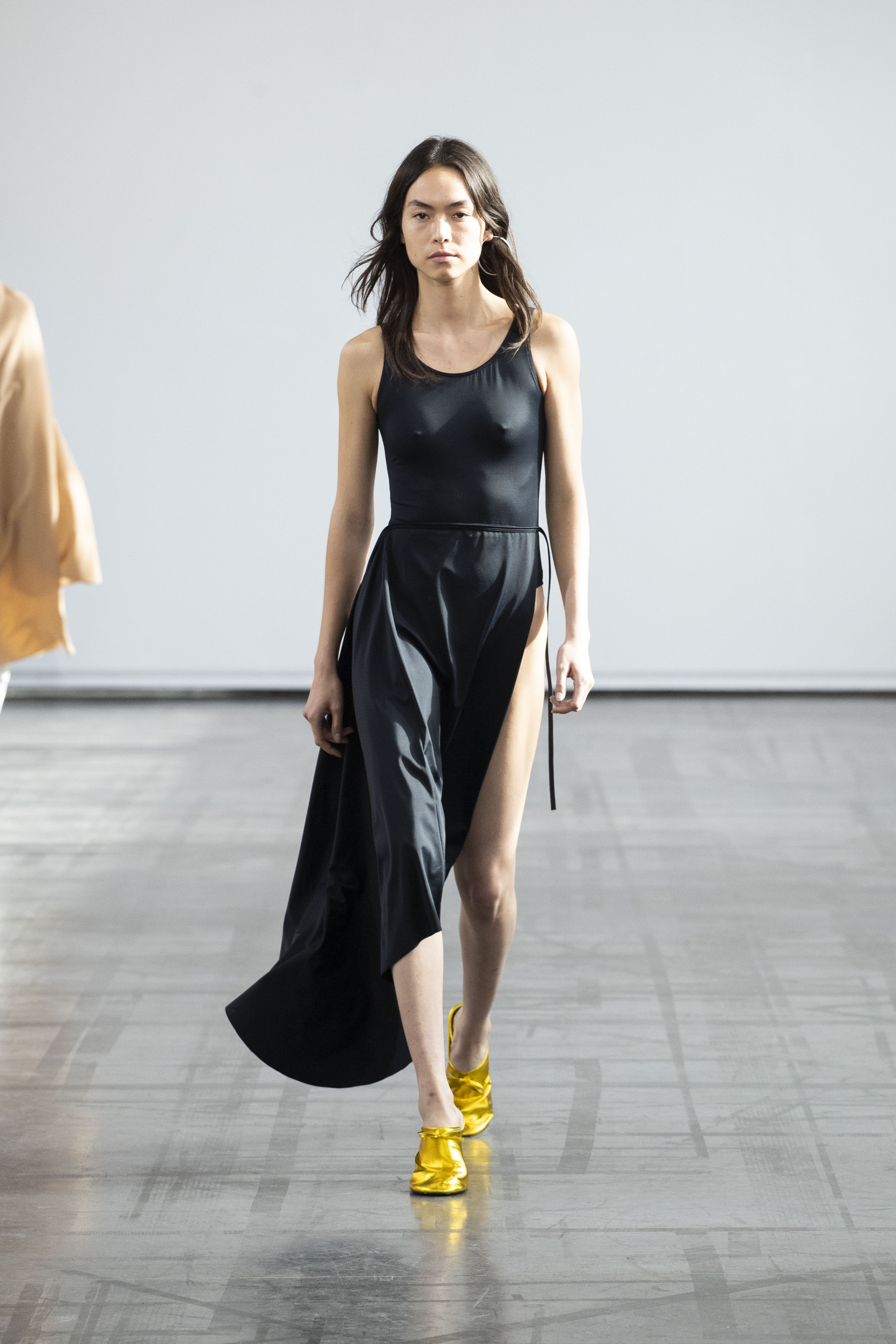 The collection is enriched by flat mules in supple leather, a trompe-l'oeil stiletto heel, a large parasol tote, pool and sand prints, and denim. The very first swimwear collection transgresses codes: they can be tied, untied or worn upside down. It's not a swimsuit. It's a top, a pareo.
